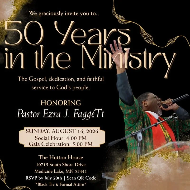 Join us as we honor and celebrate Pastor Ezra J. FaggéTt’s remarkable 50 years of faithful service, leadership, and impact in ministry. This special evening will be filled with reflection, gratitude, and joyful fellowship as we recognize a legacy of dedication and community influence.